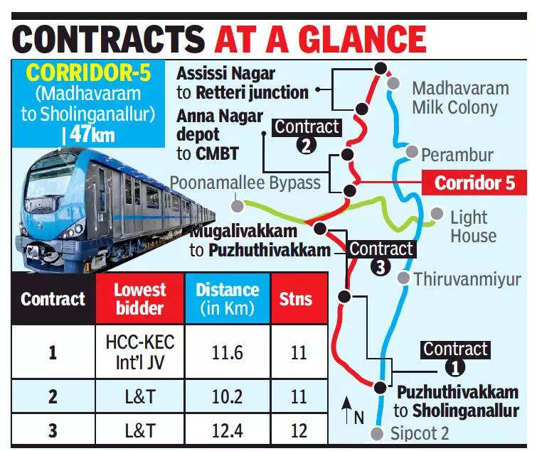 Metro rail officials said Hindustan Construction Company (HCC)- KEC International JV emerged the lowest bidder in the tender to build a 11.6km elevated line and 11 stations on the Madhavaram to Sholinganallur corridor-5. On the same corridor, Larsen & Toubro emerged the lowest bidder in the tender to build a 10.2km elevated line with 11 stations in two disjointed stretches on the northern suburbs between Madhavaram and CMBT as well as another 12.4km line with 12 elevated stations between Grain Market in Koyambedu and Elango Nagar and from Mugalivakkam to Puzhuthivakkam. An integrated highway grade separator from Mugalivakkam to MIOT hospital and a vehicular underpass at Vanuvampet are also expected to be constructed. The 118.9km phase-1 estimated to cost ₹61,843cr is expected to be ready by 2026.