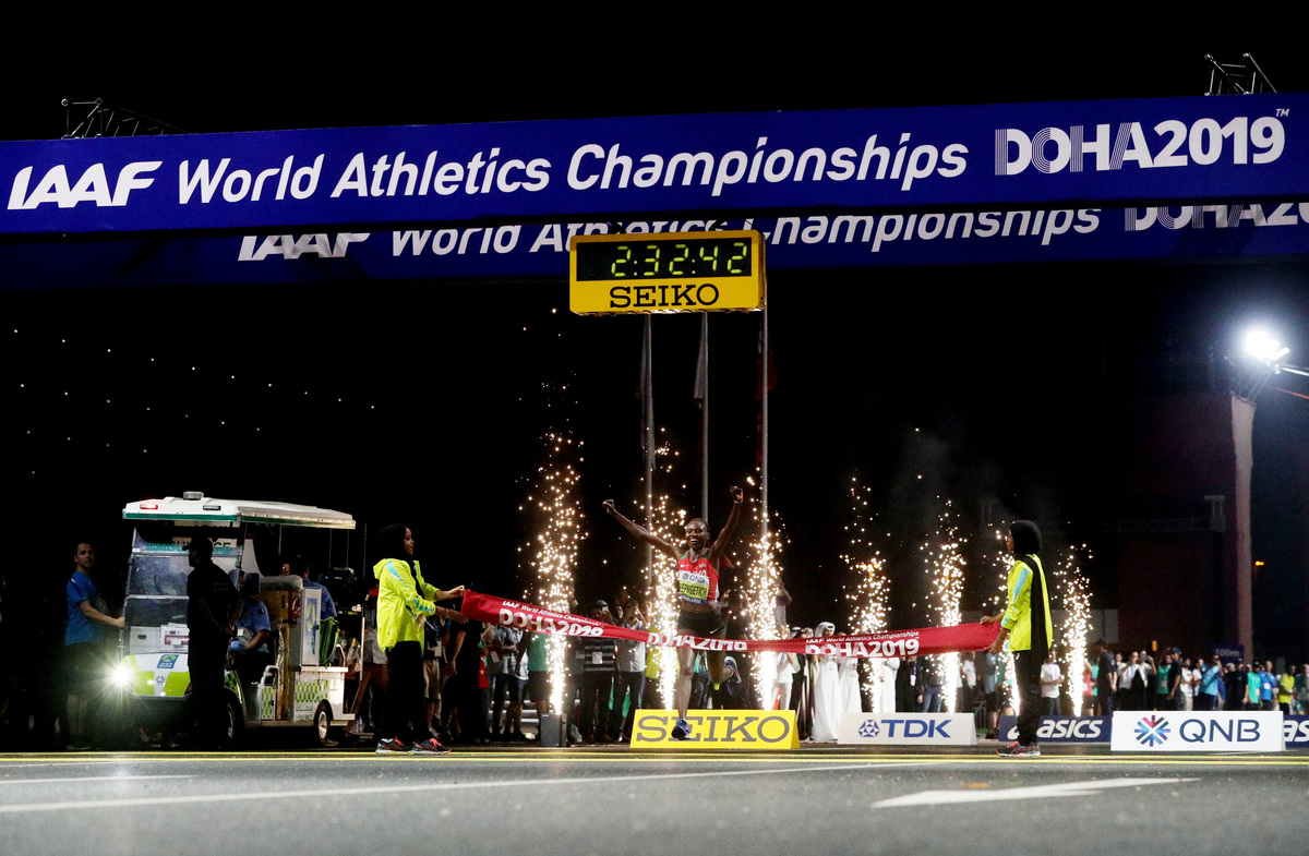 DOHA (Reuters) - Kenya's Ruth Chepngetich overcame extreme heat and humidity to win the world championship midnight marathon on Friday, in a gruelling test of survival that saw nearly a third of the 70 starters fail to reach the finish line.