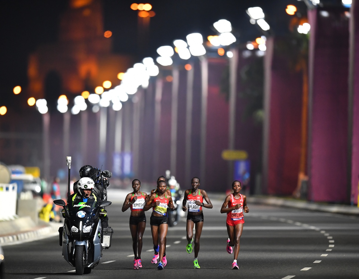 With the first gold medal of the championships up for grabs the women stepped up to the start line ready to tackle a steamy 26.2 miles (42.195 km) floodlit course along the waterfront of Doha's famous Corniche promenade.