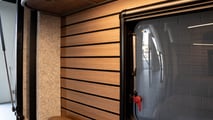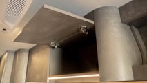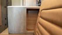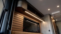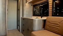 The cabinetry was made with materials supplied by Genesis Products, which provides lightweight alternatives that, in the end, helped save 290 pounds compared to a traditional layout. That’s a 45% weight reduction compared to the usual materials–a big deal, especially in an electric vehicle, where more weight means less range.