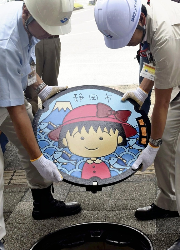 SHIZUOKA -- Two manhole covers featuring images from the popular manga series "Chibi Maruko-chan," designed and donated by none other than Momoko Sakura, the manga's late author, have recently been installed in Shizuoka, Sakura's hometown and the setting of her story.