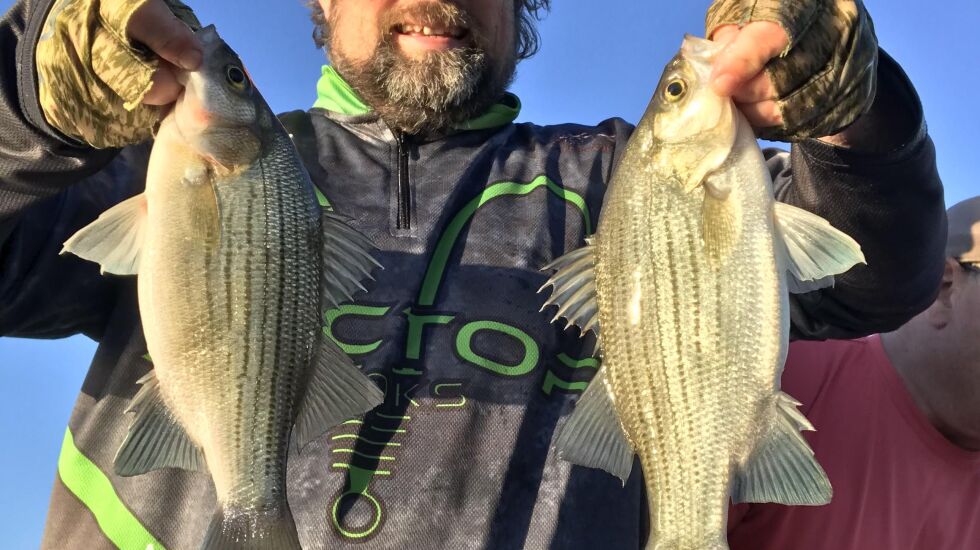 Options are changing or will change, it’s that time of the year, as Ken “Husker” O’Malley shows with white bass from the Illinois River. A fuller report and suggestions of how to fish now are in the Illinois River report below.