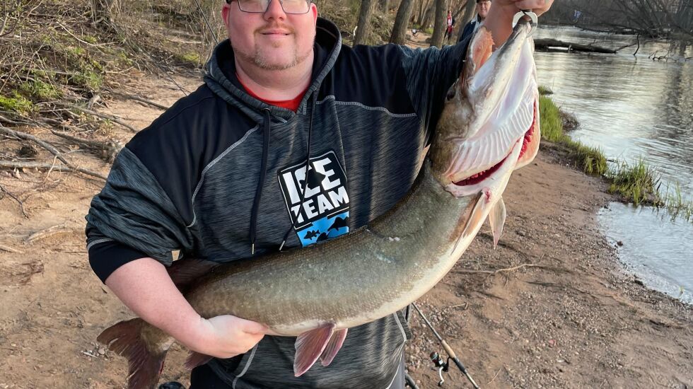 Dale, my son Paul Jackson got this Muskie, Saturday while we were fishing for Walleyes on Wisconsin river near the dells, 6 lb test, fish was released.