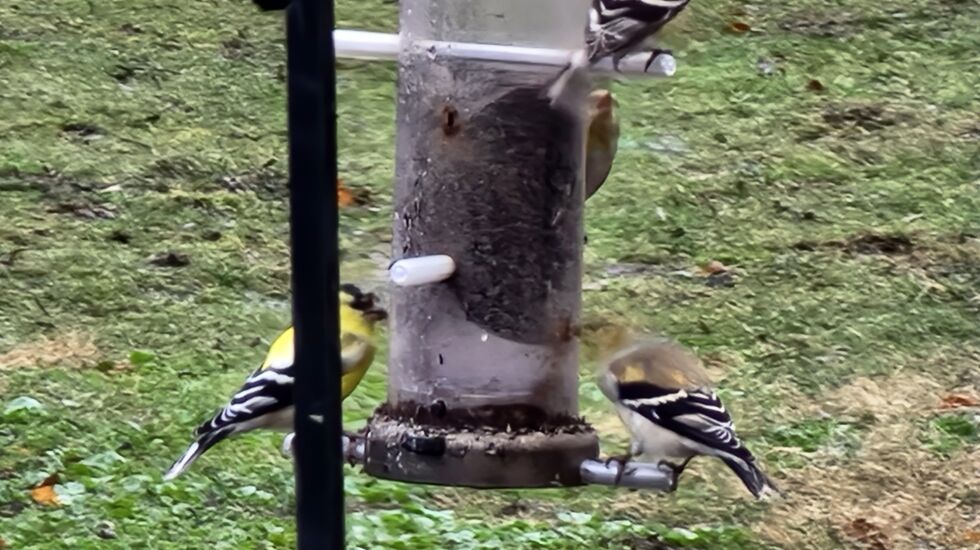 Michael Dodd photographed American goldfinches in both winter and spring colors at a thistle feeder in the south suburbs. It’s that time of year.