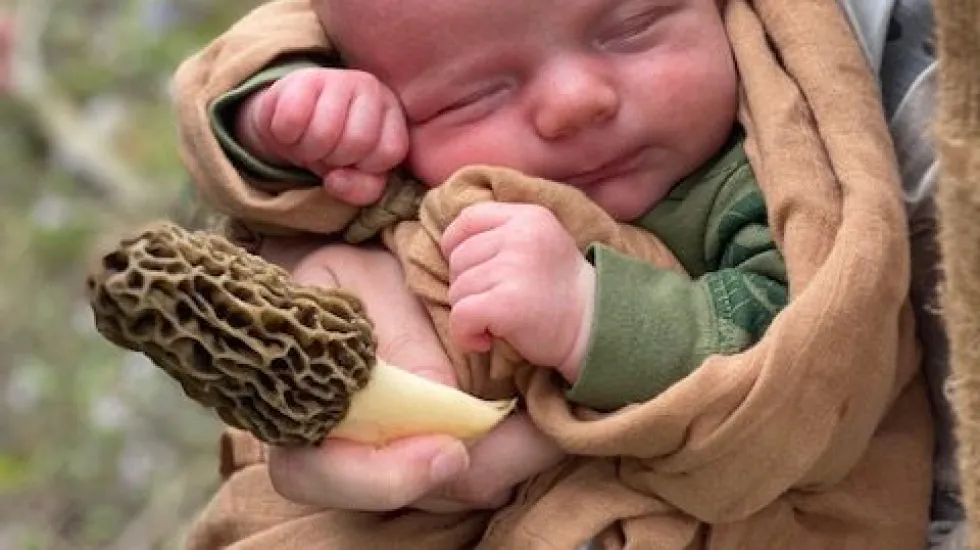 “First morel mushroom hunt for River Kubinski, 4-week-old grandson.” Sue Kubinski