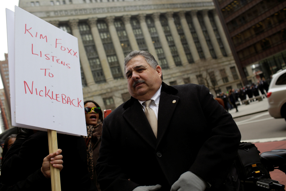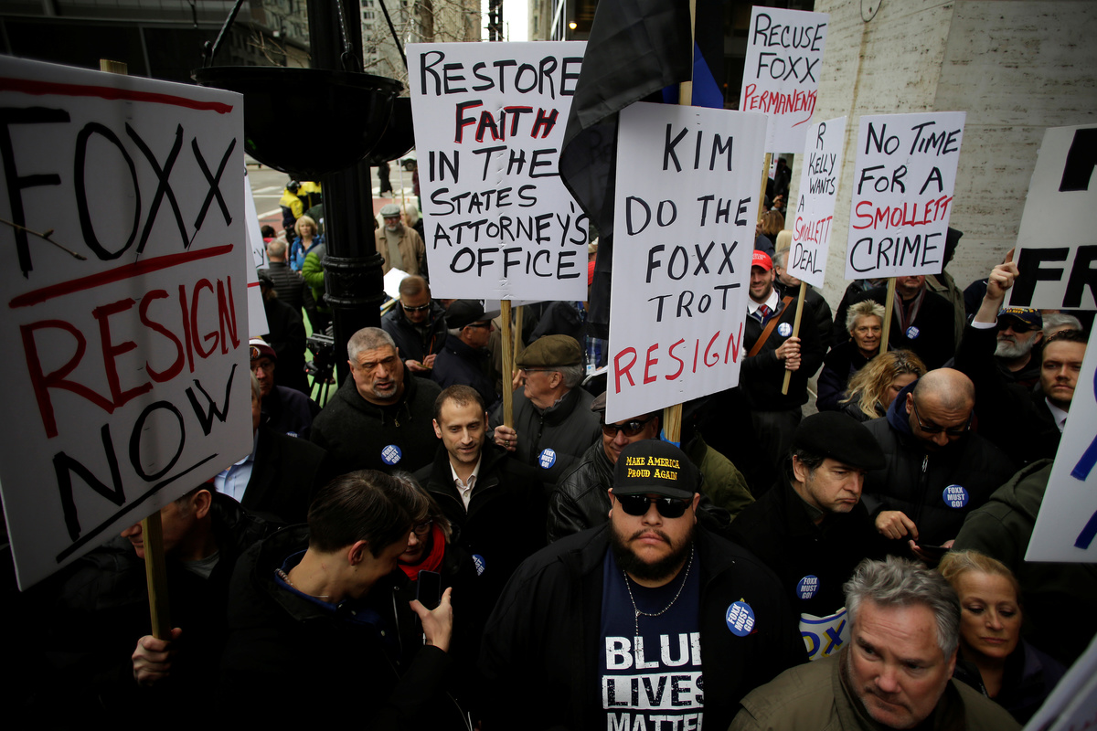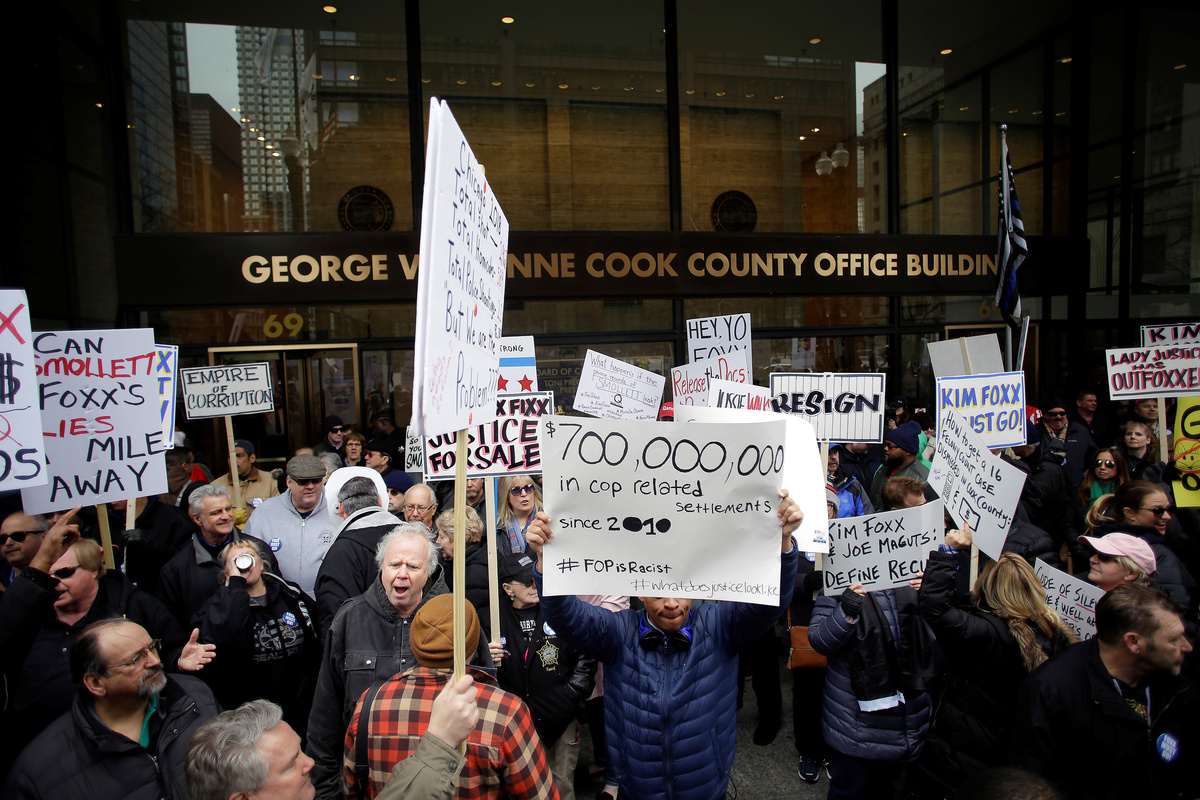 About 300 people, including off-duty Chicago police officers, gathered at the building where Foxx’s office is located in downtown Chicago, wearing "Foxx Must Go!" buttons and carrying signs reading "Resign now" and "Who let the Foxx in the henhouse."