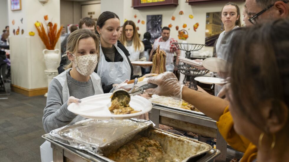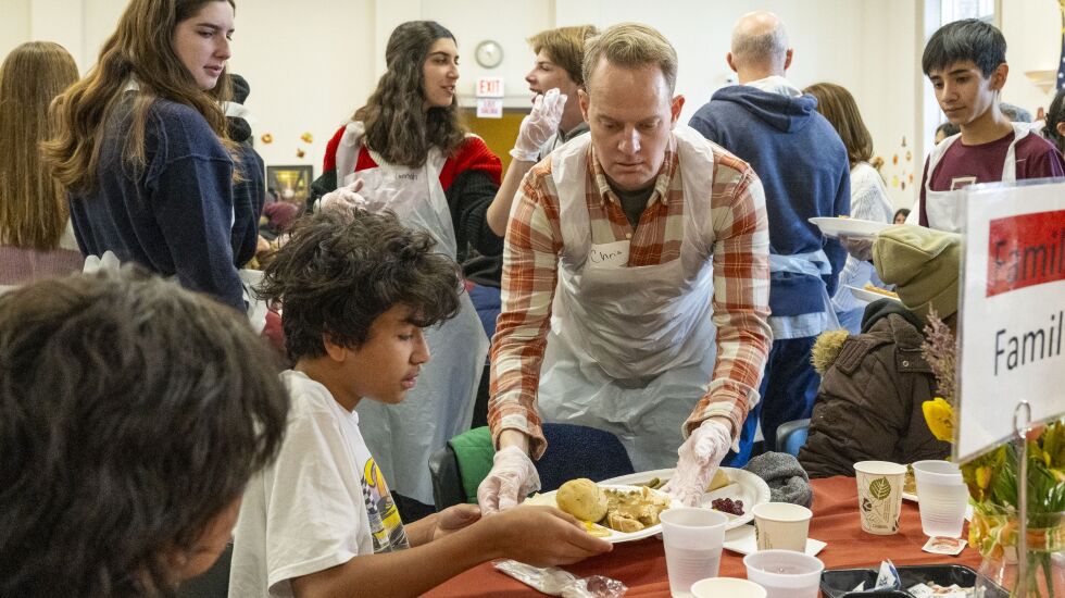 The holiday event was an extension of the group’s usual programming, feeding about 350 people every Tuesday. The charity expected to fill the 140-person room three times Thursday, with 50 volunteers serving.