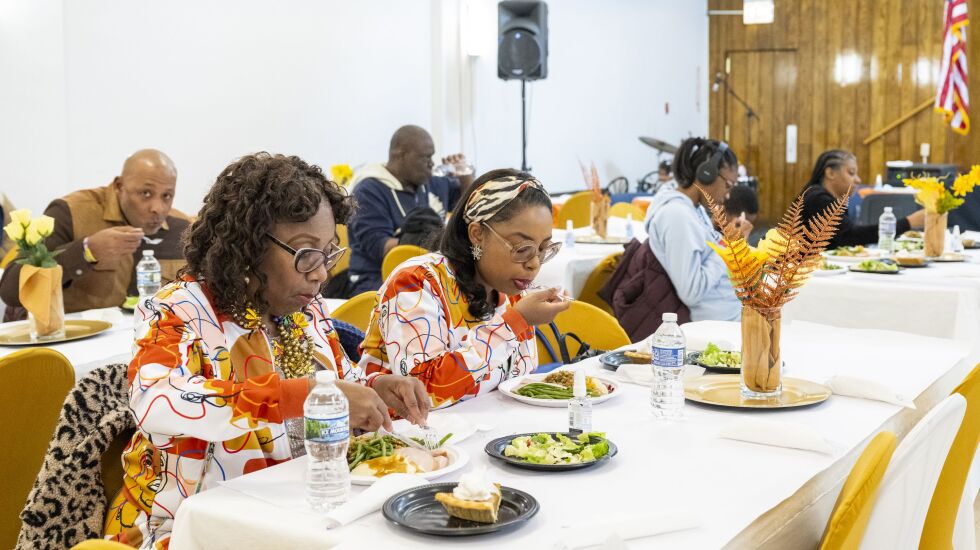 Yoga teacher Sapphire Robinson, an Englewood resident, attended the event for the first time with her family after one of her students recommended it. She said she was happy about the variety of greens being served and was excited to try pumpkin pie for the first time.
