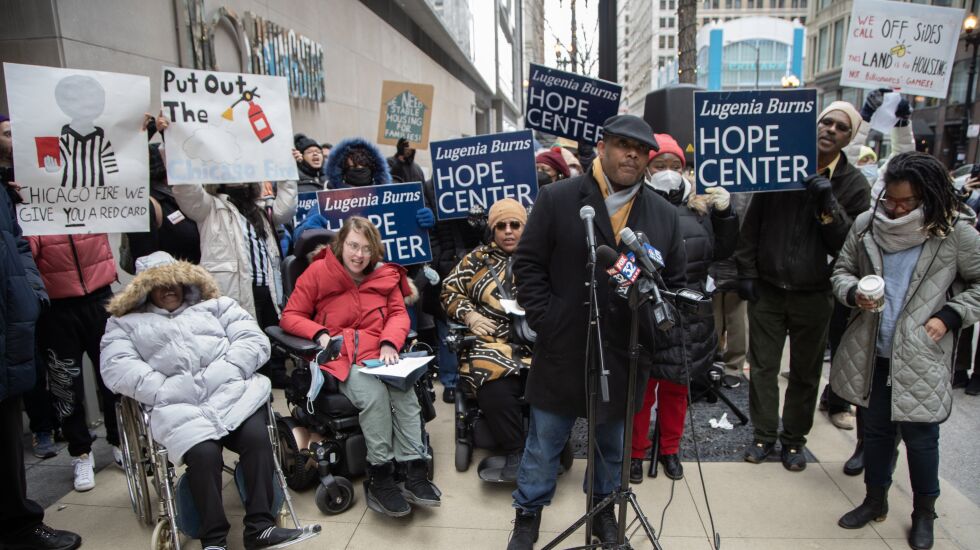 The West Side resident was among several dozen people — some also in wheelchairs — gathered outside Morningstar Inc.’s office, 22 W. Washington St., to protest founder Joe Mansueto’s plan to build an $80 million training facility for his Chicago Fire soccer team on a former public housing site.