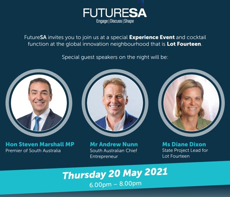 It promoted the evening's "special guest speakers" Premier Steven Marshall, SA Chief Entrepreneur Andrew Nunn and State Project Lead for Lot Fourteen, Diane Dixon.