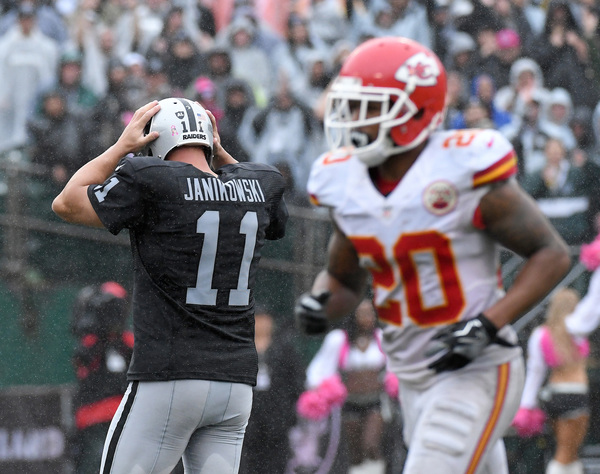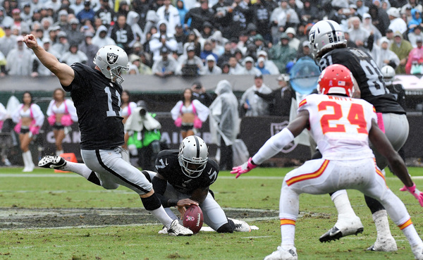 Kicker Cairo Santos missed the ensuing extra point however, leaving the score at 13-7, and that wasn't Santos' only issue of the day. He also failed to knock in a 38-yard field goal with 28 seconds left in the half, which gave Oakland enough time to drive 44 yards and set up a 46-yard field goal by Sebastian Janikowski, who cut the Chiefs' lead to 13-10 at halftime.