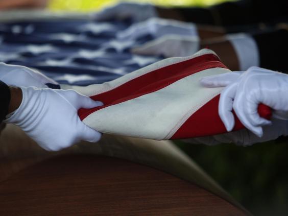 A military honor guard folds the the American Flag a top the casket of US Army Specialist Daniel Agami of the 1st Infantry Division as he is laid to rest at Star of David Memorial Gardens June 26, 2007 in North Lauderdale, Florida (Joe Raedle/Getty Images)