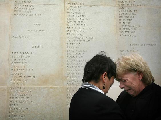Mothers Theresa Evans (L) and Anne Lawrence meet for the first time and console each other after finding the names of their sons inscribed on the wall of the Armed Forces Memorial and discovering their sons had both died within 24 hours each other in Iraq, 12 October, 2007 (Christopher Furlong/Getty Images)
