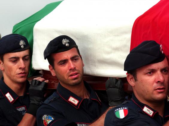 Italian carabinieri carry a flag draped coffin of their slain comrade during a November 15, 2003 (Scott Nelson/Getty Images)