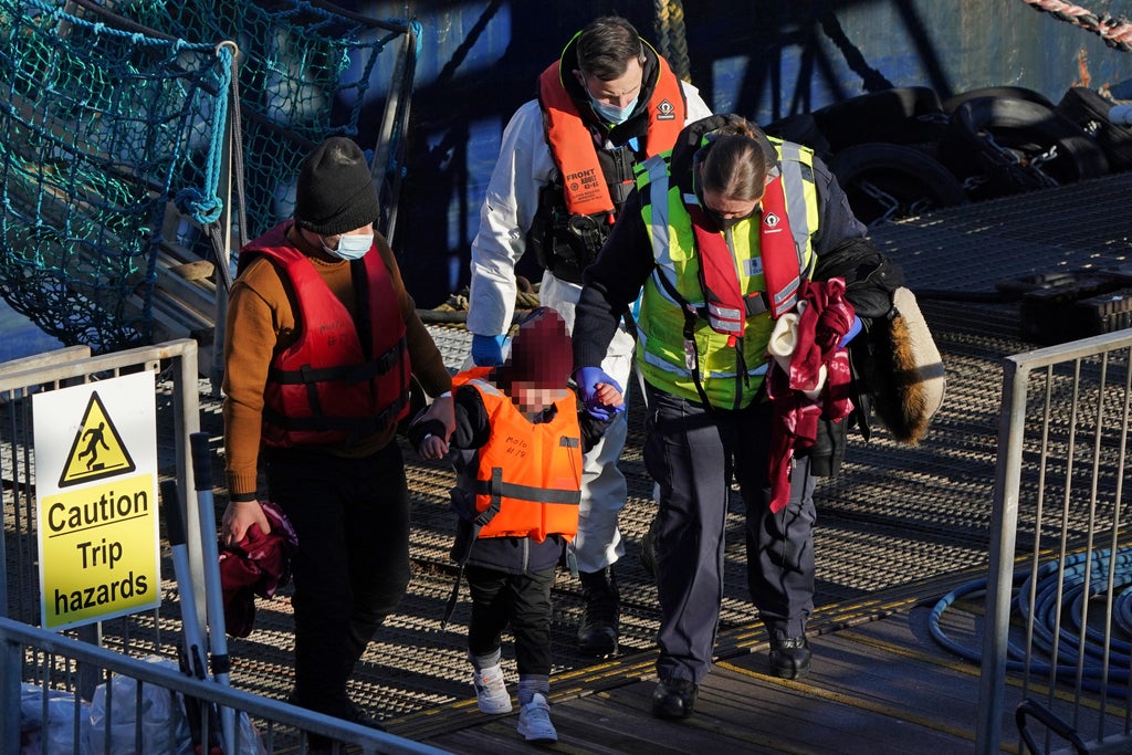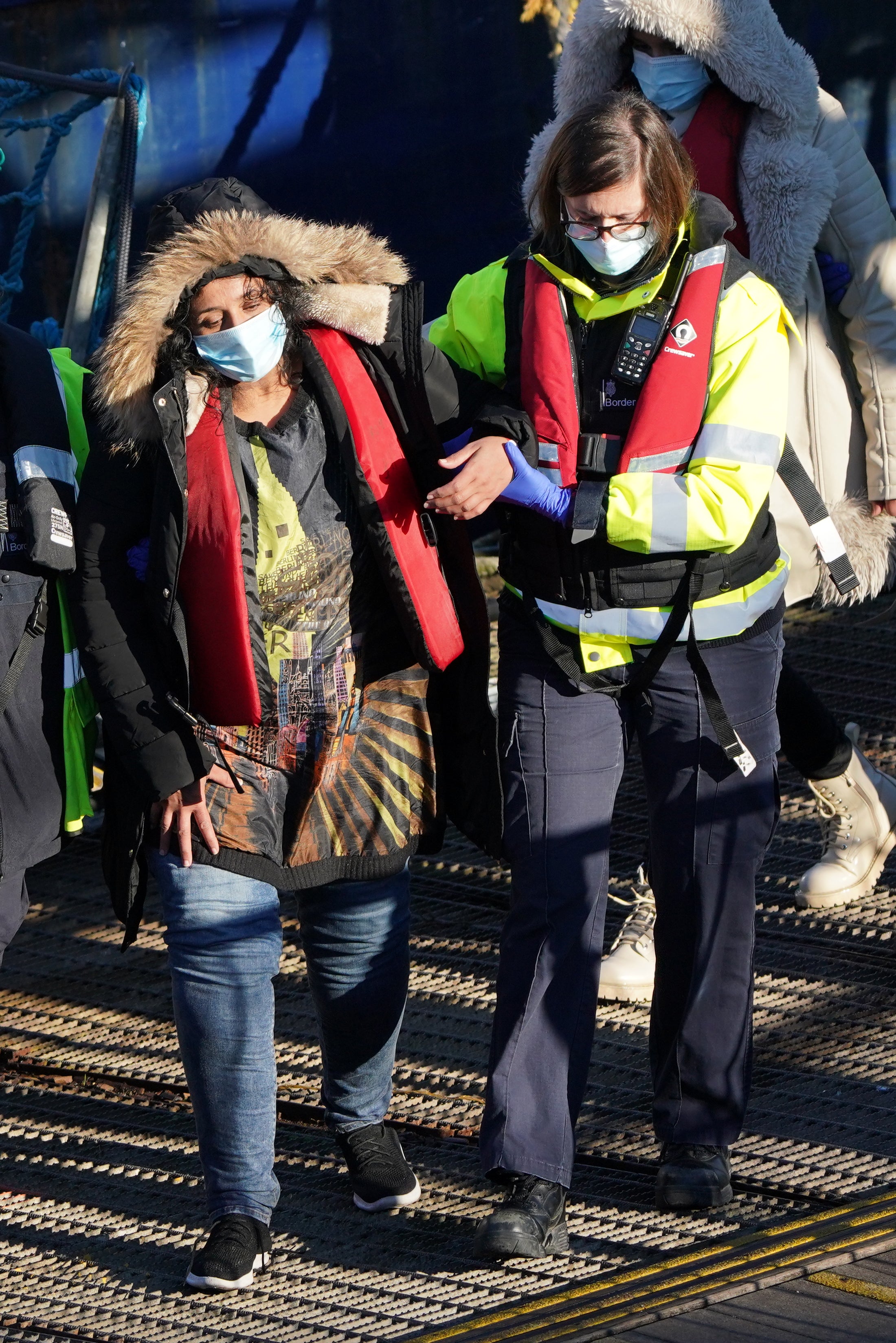 A young child wrapped in a lifejacket and wearing a beanie hat was among those seen being helped up a gangway in the port of Dover