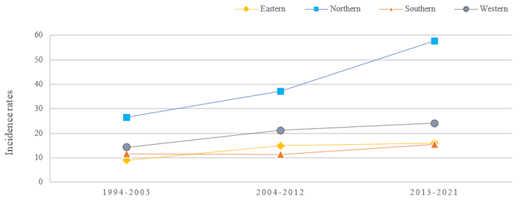 In Spain, the numbers have risen less sharply. In the period from 1994 to 2003, there were 16 cases per 100 000 person-years, rising only slightly to 17.5 between 2013 and 2022.