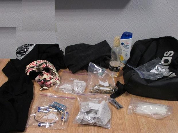 Officers later searching his “hideout” discovered a rucksack filled with screws, boards, and a flammable liquid that prosecutors said were components for an explosive device.