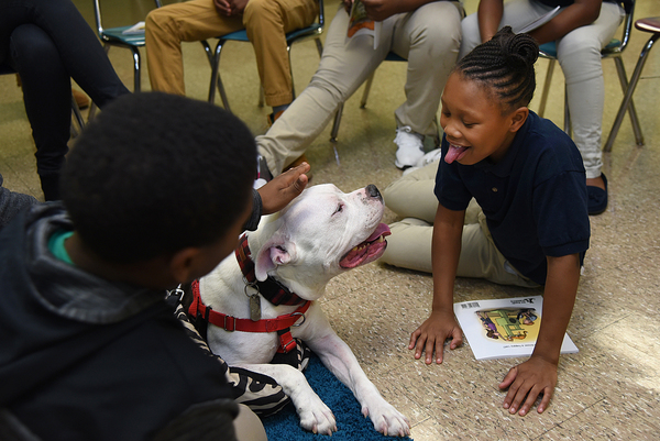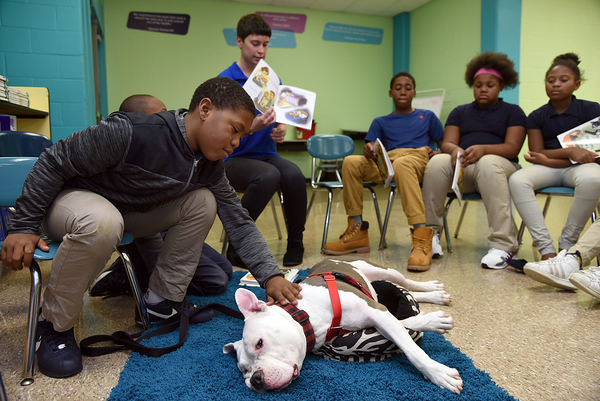 BALTIMORE _ The gray and white pit bull sat in the center of the circle of fifth-graders. He listened attentively as the students took turns reading to him. At times, his droopy eyes appeared to lock with those of the readers.