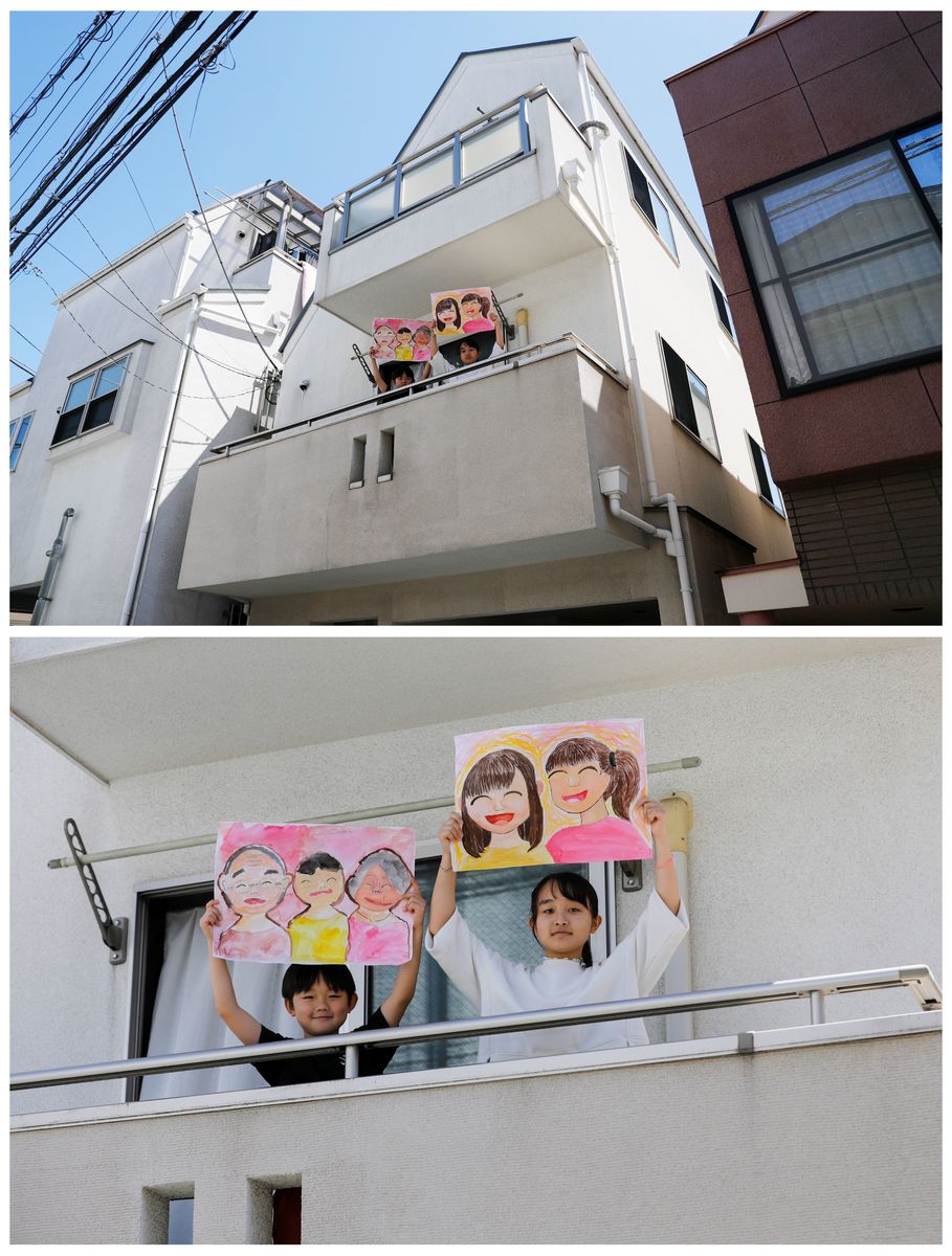 Reku Matsui, 8, and Yaya Matsui, 12, pose for a photograph while holding pictures that they drew during the coronavirus disease (COVID-19) outbreak, as they stand on the balcony of their home in Tokyo, Japan, April 19, 2020. REUTERS/Kim Kyung-Hoon