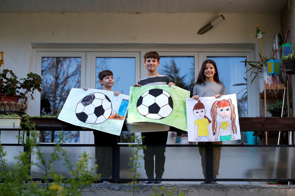 Ivan Posta, 8, Vince Posta, 11, and Vilma Posta, pose for a photograph while holding pictures that they drew during the Coronavirus disease (COVID-19) outbreak, while standing on the balcony at their home in Budapest, Hungary, April 10, 2020. REUTERS/Bernadett Szabo