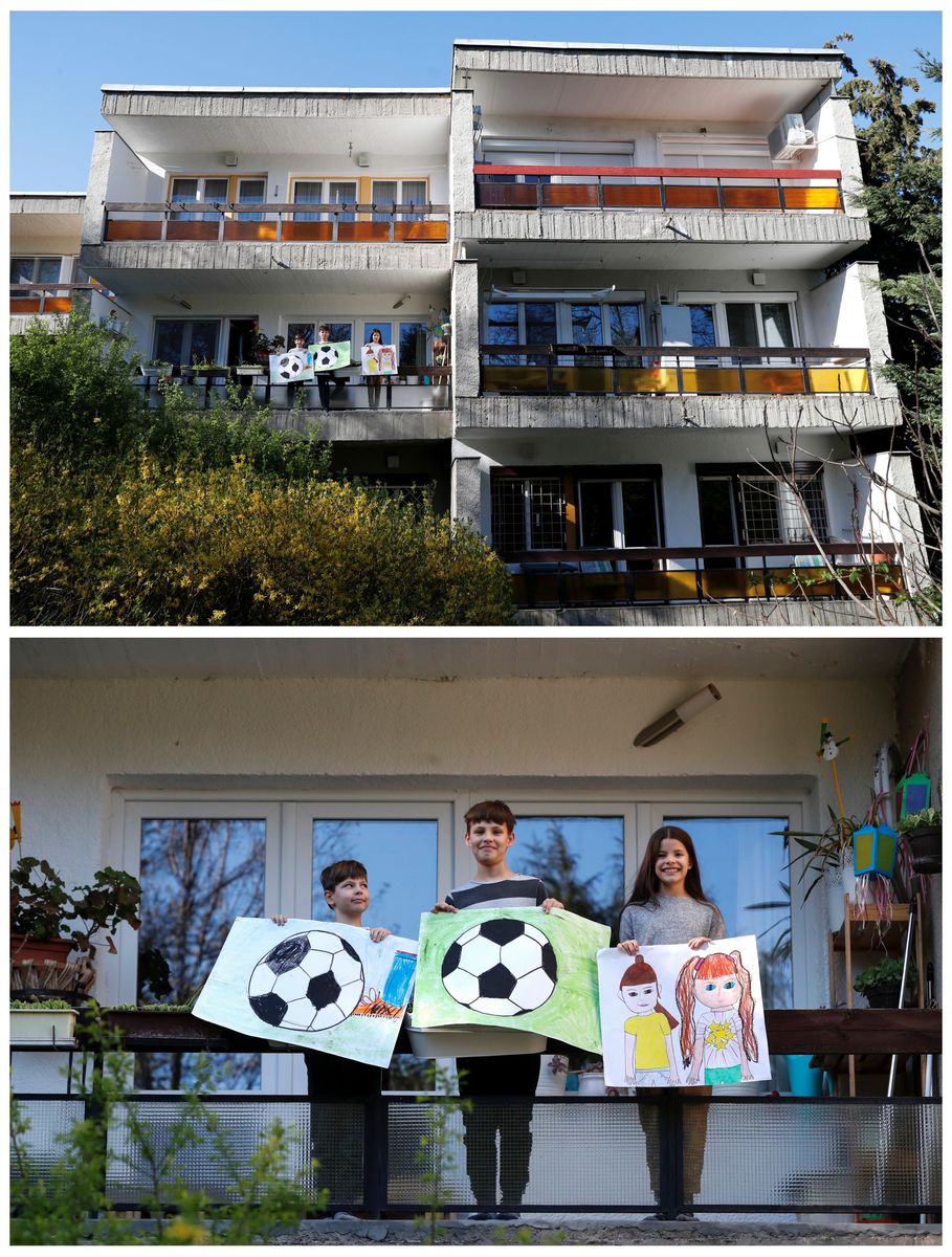 A combination picture shows Ivan Posta, 8, Vince Posta, 11, and Vilma Posta, 10, posing for a photograph while holding pictures that they drew during the Coronavirus disease (COVID-19) outbreak, while standing on the balcony at their home in Budapest, Hungary, April 10, 2020. REUTERS/Bernadett Szabo