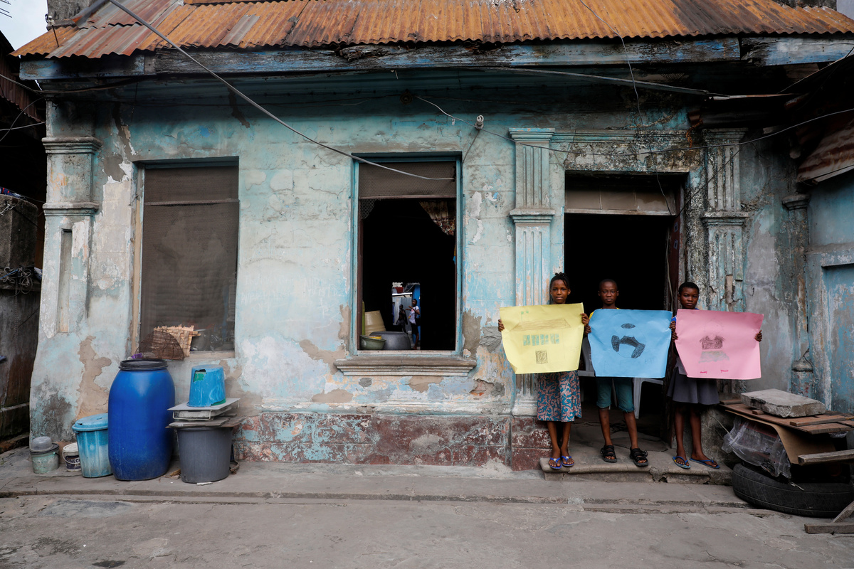 Sofiat Kolawole, 8, Olatunji Adebayo, 11, and Amira Akanbi 11, pose for a photograph while holding pictures that they drew during the coronavirus disease (COVID-19) outbreak, as they stand in front of their house in Lagos, Nigeria, April 18, 2020. REUTERS/Temilade Adelaja
