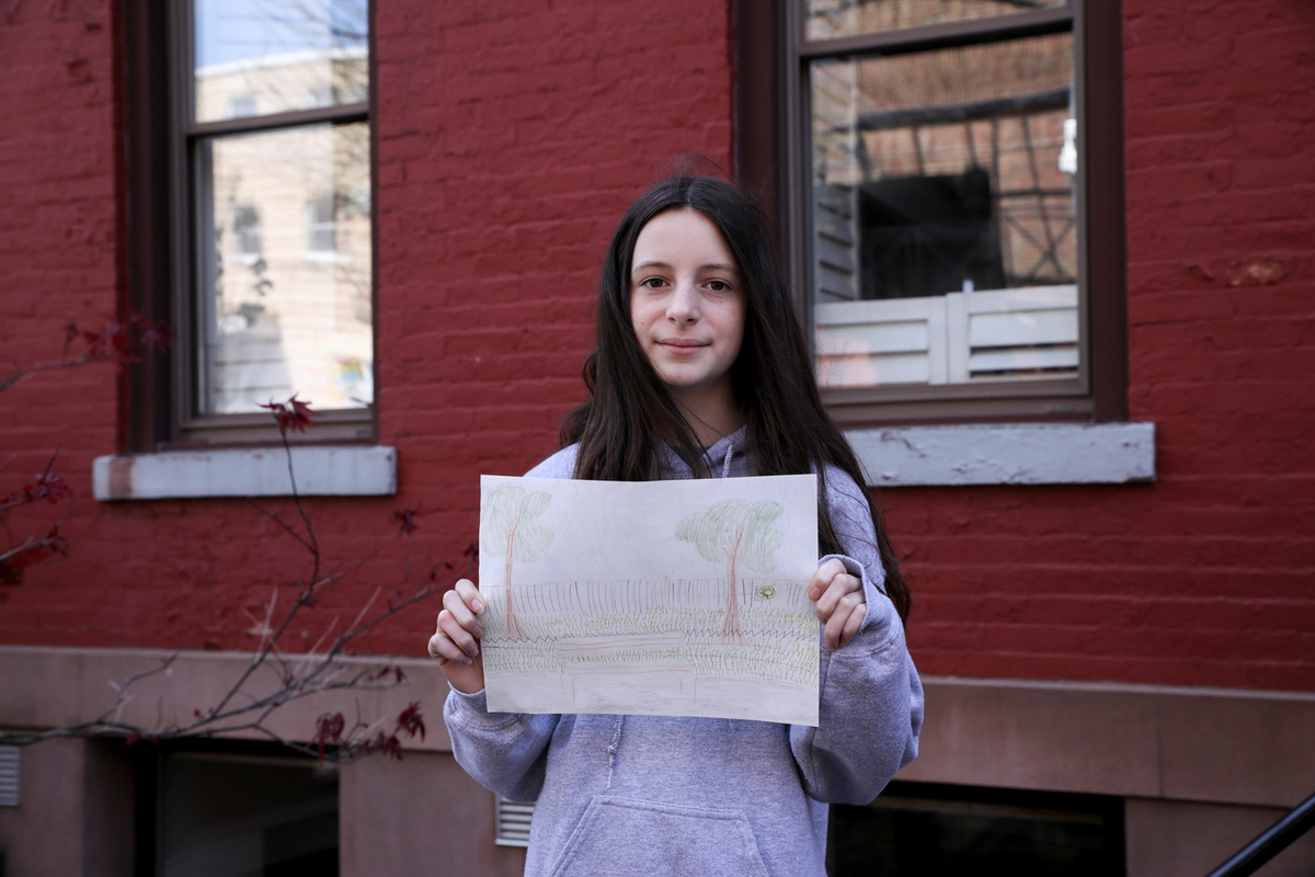 Jane Hassebroek, 13, poses for a photograph while holding a picture that she drew during the coronavirus disease (COVID-19) outbreak, while standing outside her home in Brooklyn, New York, U.S., April 19, 2020. REUTERS/Caitlin Ochs