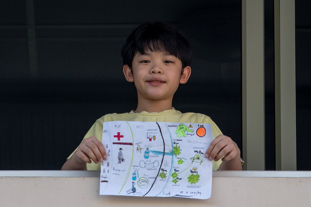 Nipoon Kitkrailard, 10, who lives in Thailand's Samut Prakan province, has drawn the virus as a monster coming to invade the world, but medical workers and items including hand gel and face masks hold it back.
