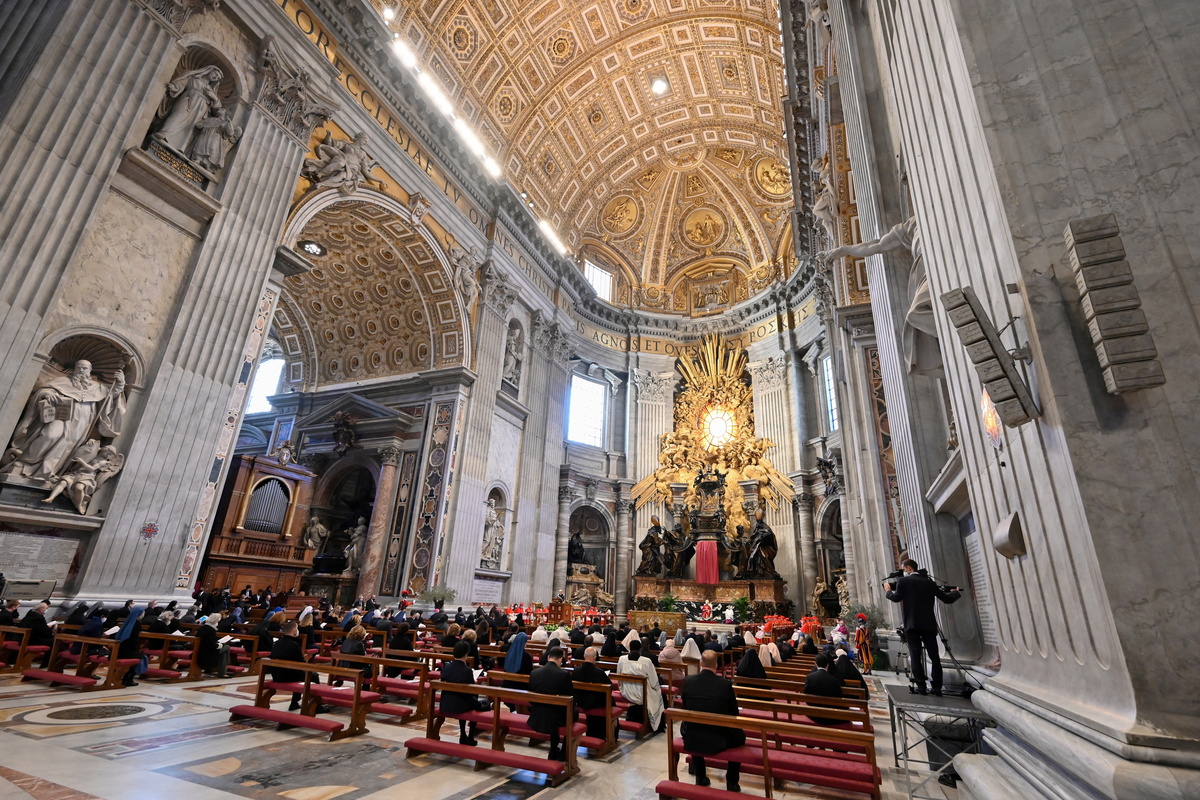 Candles in the form of a huge cross dotted an empty St. Peter's Square as about only 200 people took part, sitting on either side of the pope immediately in front of St. Peter's Basilica.