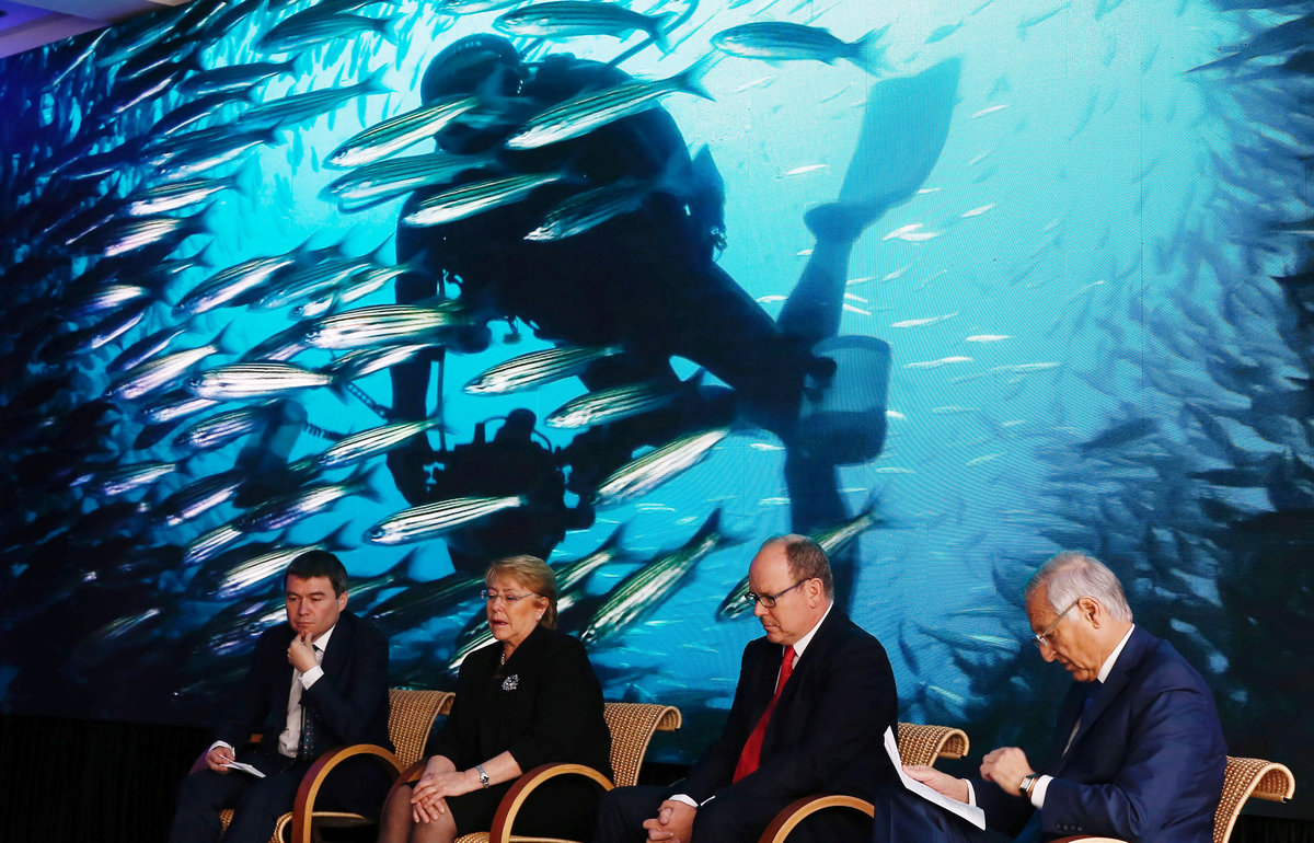 Chile's President Michelle Bachelet is flanked by Chile's Environment Minister Marcelo Mena (L), Monaco's Prince Albert (2nd R) and Chile's Foreign Minister Heraldo Munoz (R) as they watch a video during a meeting of the 4th International Marine Protected Areas Congress (IMPAC4) in Vina del Mar, Chile, September 9, 2017 REUTERS/Rodrigo Garrido