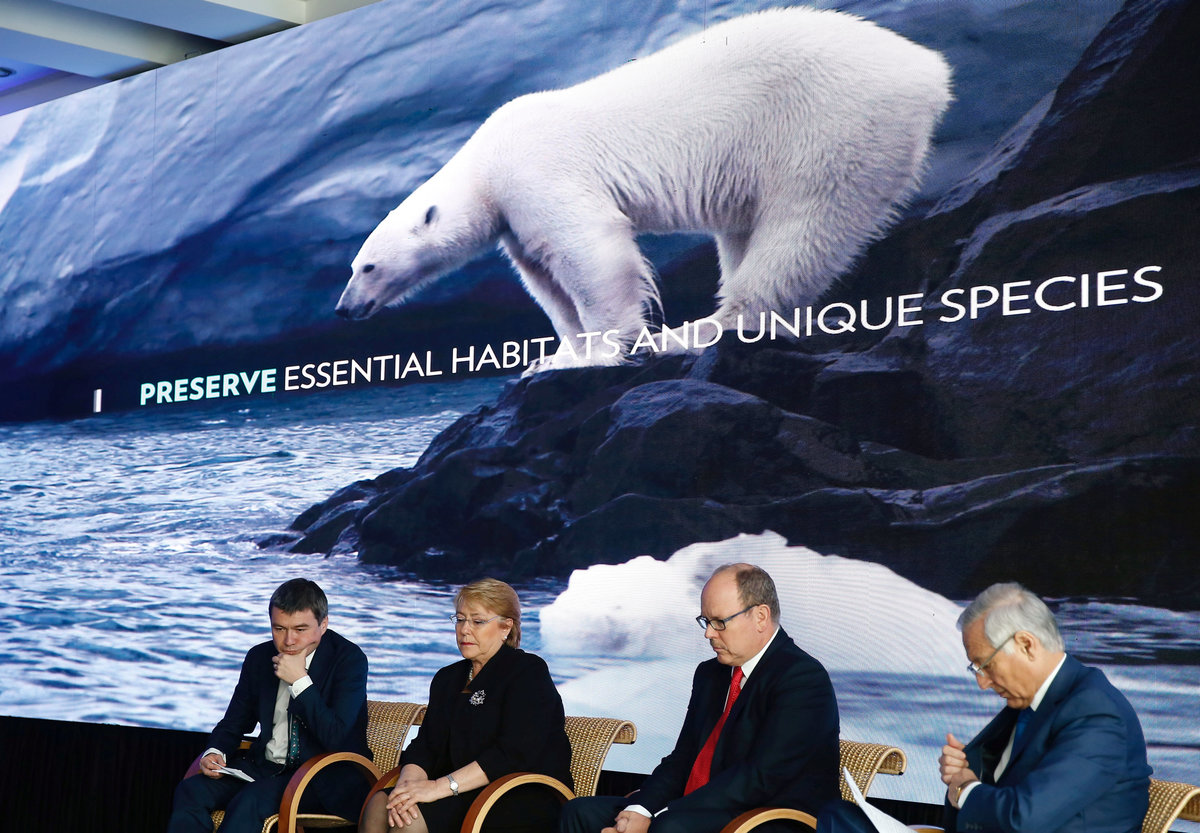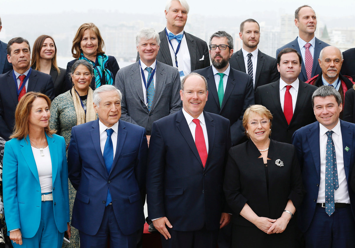 Chile's president Michelle Bachelet next to Chile's Minister of the environment Marcelo Mena(L), Monaco's Prince Albert II (3th L-R) and Chile's Foreign Minister Heraldo Munoz, are seen they watch a video during a meeting of the 4th International Marine Protected Areas Congress (IMPAC4) in Vina del Mar, Chile September 9, 2017 REUTERS/Rodrigo Garrido