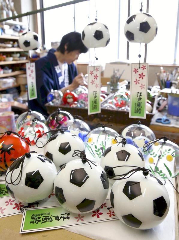 A craftsperson paints a furin glass wind chime to make it look like a soccer ball at Shinohara Furin Honpo in Edogawa Ward, Tokyo, ahead of the FIFA World Cup in Russia this summer. Wind chime makers have been producing soccer ball designs since the 2002 World Cup, which was cohosted by Japan and South Korea.