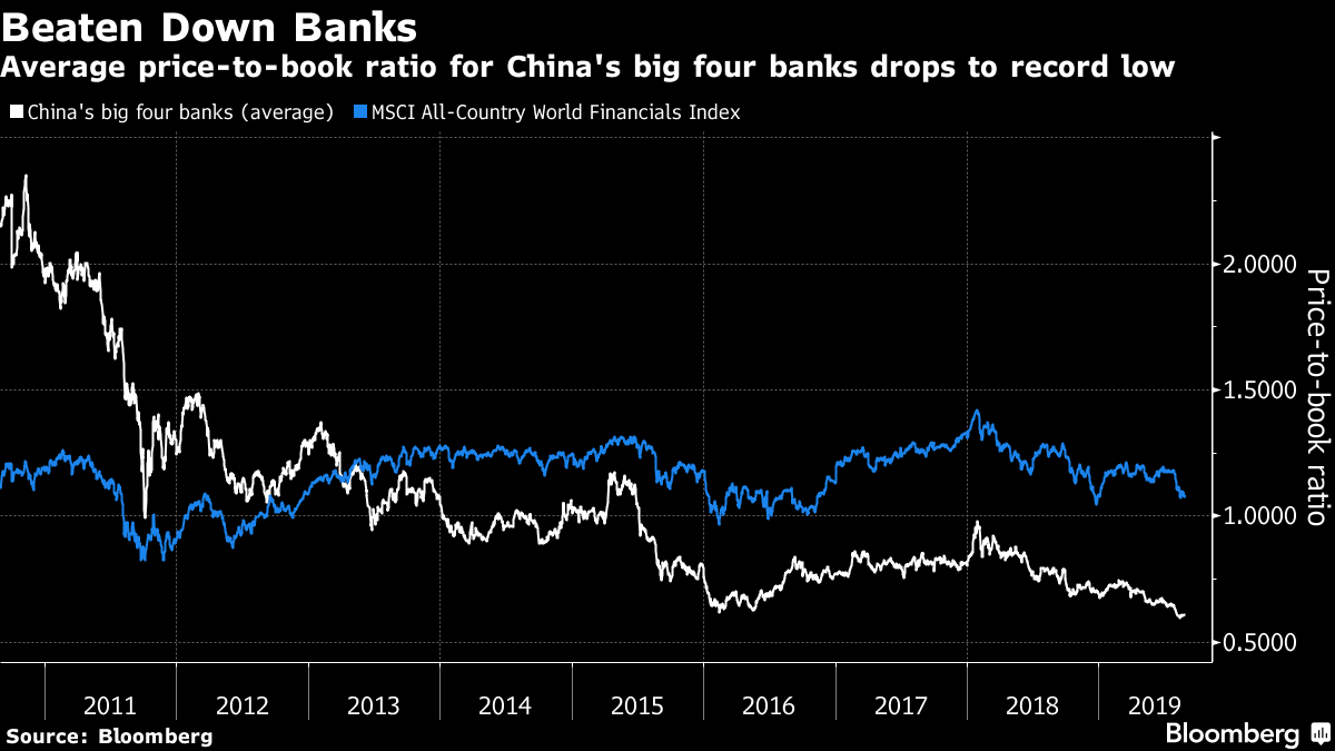 The MSCI China Banks Index underperformed the MSCI China Index by about 13% this year as valuations of mainland lenders approach historic lows. ICBC and CCB saw their China-listed shares fall on Friday.