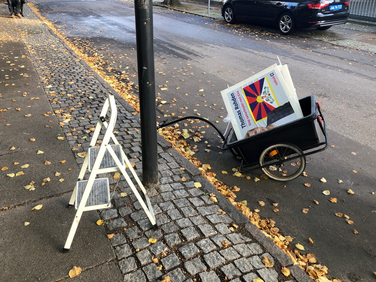 Ten posters of a candidate in a local election standing next to the Tibetan flag were removed shortly after he put them up outside the Chinese mission in a suburb of the capital Copenhagen.