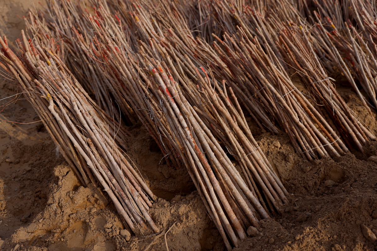The flowering bush known as the sweetvetch has an 80% success rate even in harsh desert conditions and has become a key part of efforts to "hold down the sand", a term used locally for planting bushes and grasses in even squares across the desert slopes to stop sand drifting into nearby farmland.