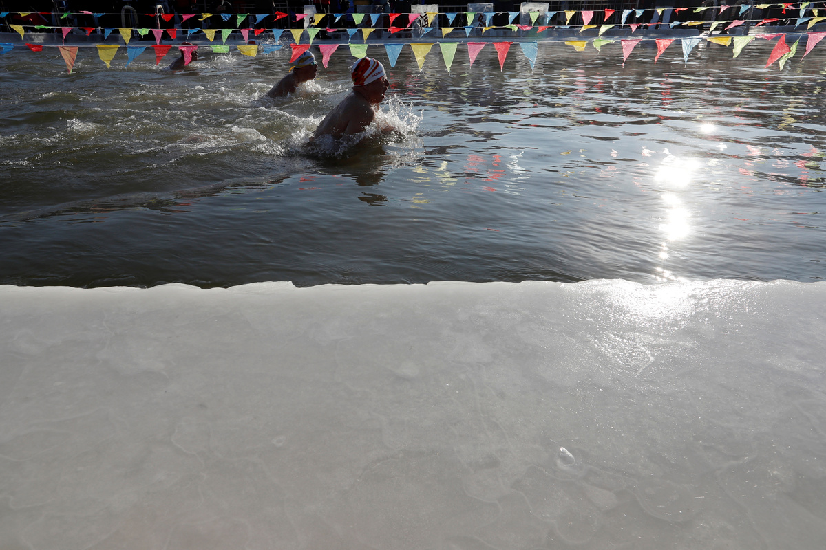 Participants swim in a pool carved out of the frozen Songhua River during an ice swimming competition as a part of the annual ice festival, in the northern city of Harbin, Heilongjiang province, China January 5, 2019. REUTERS/Tyrone Siu
