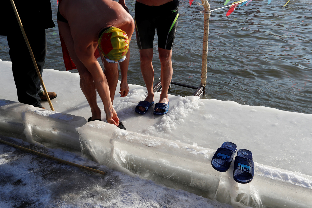 More than 300 men and women, wearing just ordinary trunks and swimsuits, on Saturday braved the bitter cold waters in the ice swimming meet, part of Harbin's annual winter festival, among the biggest in the northern hemisphere.