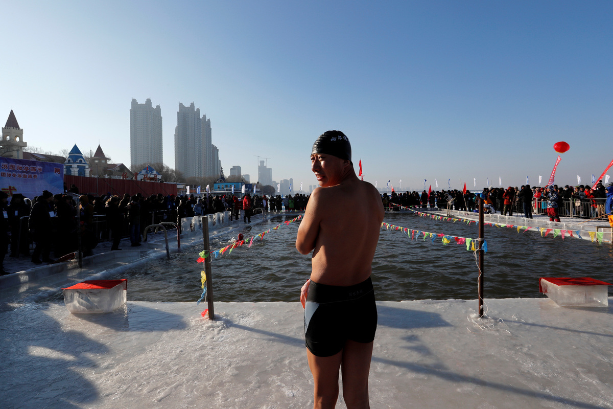 A swimmer reacts before an ice swimming competition during the annual ice festival, in the northern city of Harbin, Heilongjiang province, China January 5, 2019. REUTERS/Tyrone Siu
