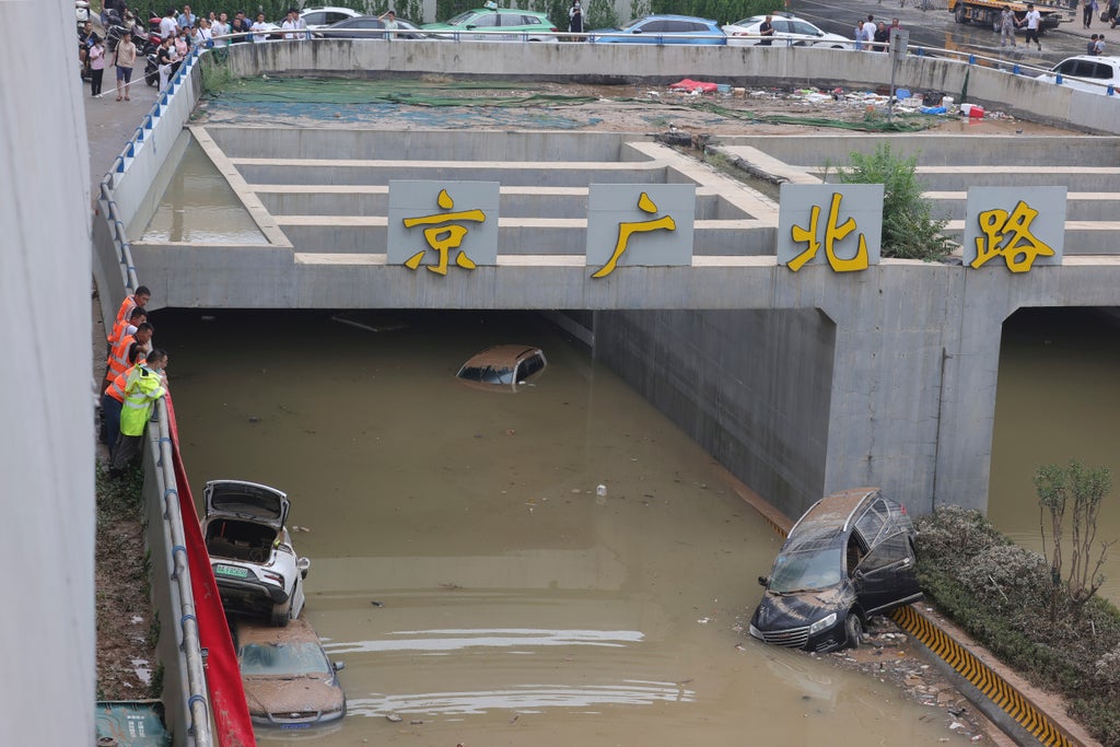 In Zhengzhou, a city of 12 million people, crews used pumps to drain a flooded traffic tunnel following rains the government said were the heaviest on record.