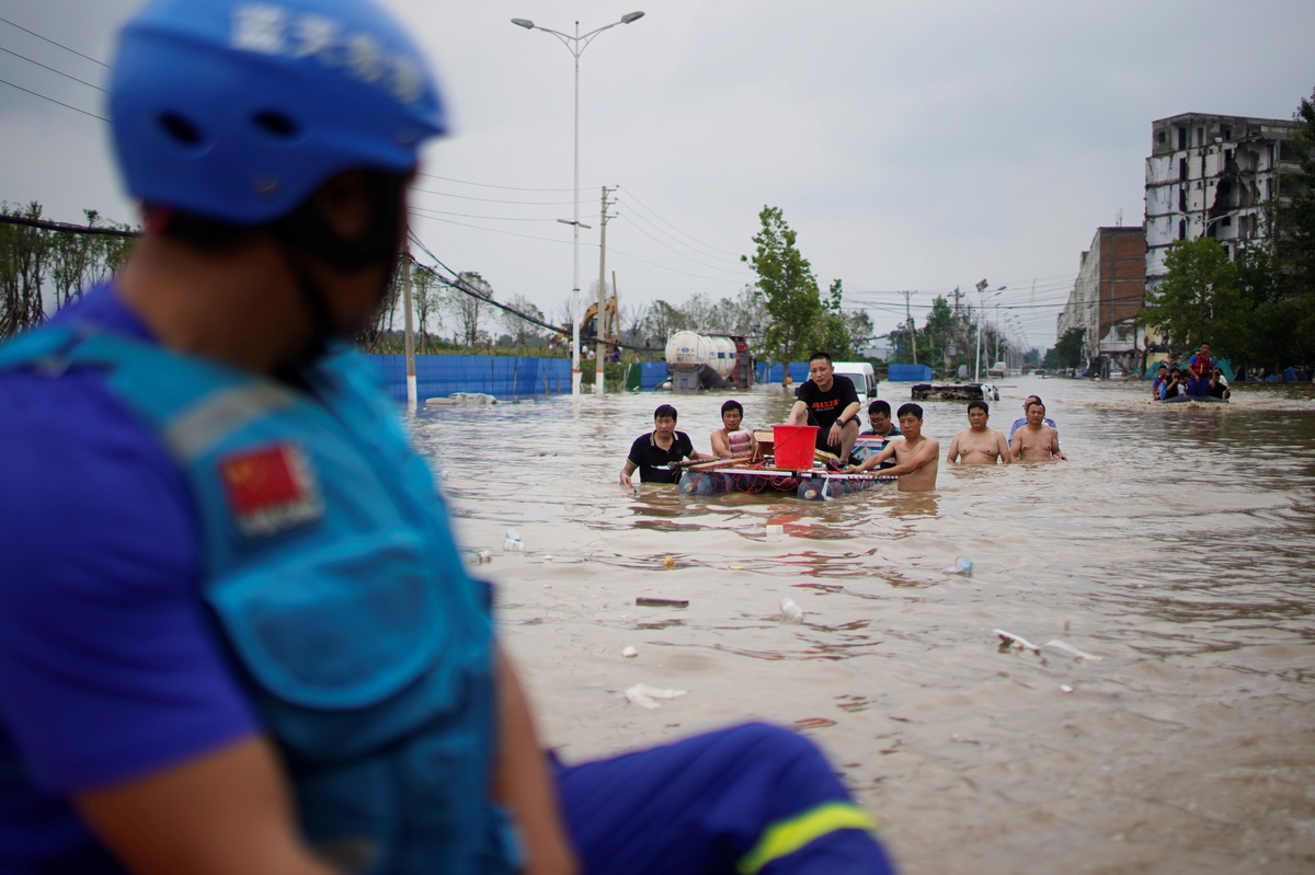 One group of 15 volunteers from a construction firm based in Sichuan province were using a boat to transport residents who had been trapped in a high-rise condominium.