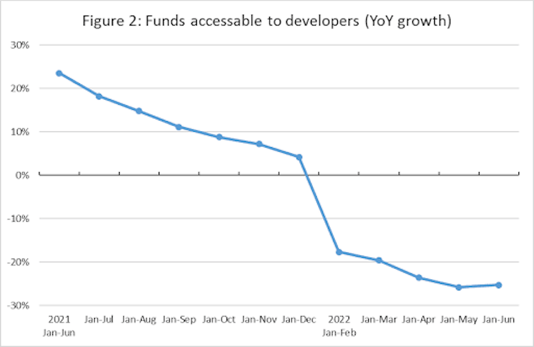 The weak market has substantially reduced the funding available to developers, as figure 2 below shows. This is the root cause of the current situation in which developers have paused building, causing homeowners to strike by refusing to pay their mortgages.