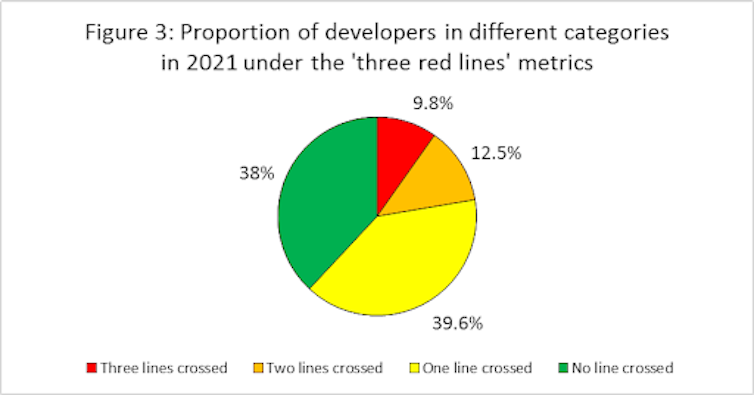 More than 60% of developers have hit at least one of the debt thresholds set by regulators in 2021, as shown in figure 3 below. Around 10% – crisis-hit Evergrande included – have breached all three. When this happens, developers are not allowed to raise new borrowing for that year. The resulting credit crunch has pushed many developers into a stressed position, with some even defaulting.