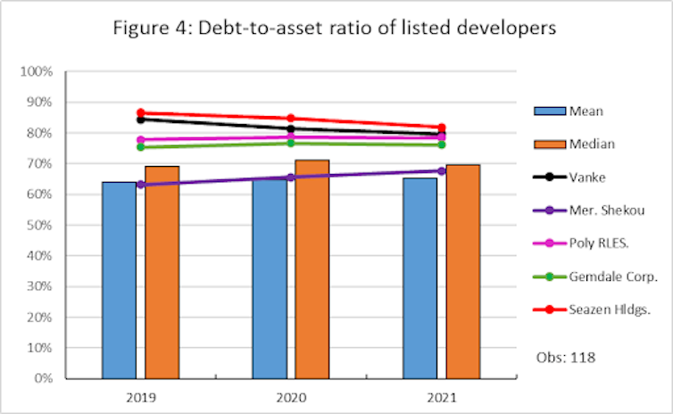 This is not alarmism: Chinese developers generally borrow a lot of money to fund ongoing construction. While the industry average debt-to-asset ratio is around 65%, some of the leading companies are even more indebted (see figure 4 below).