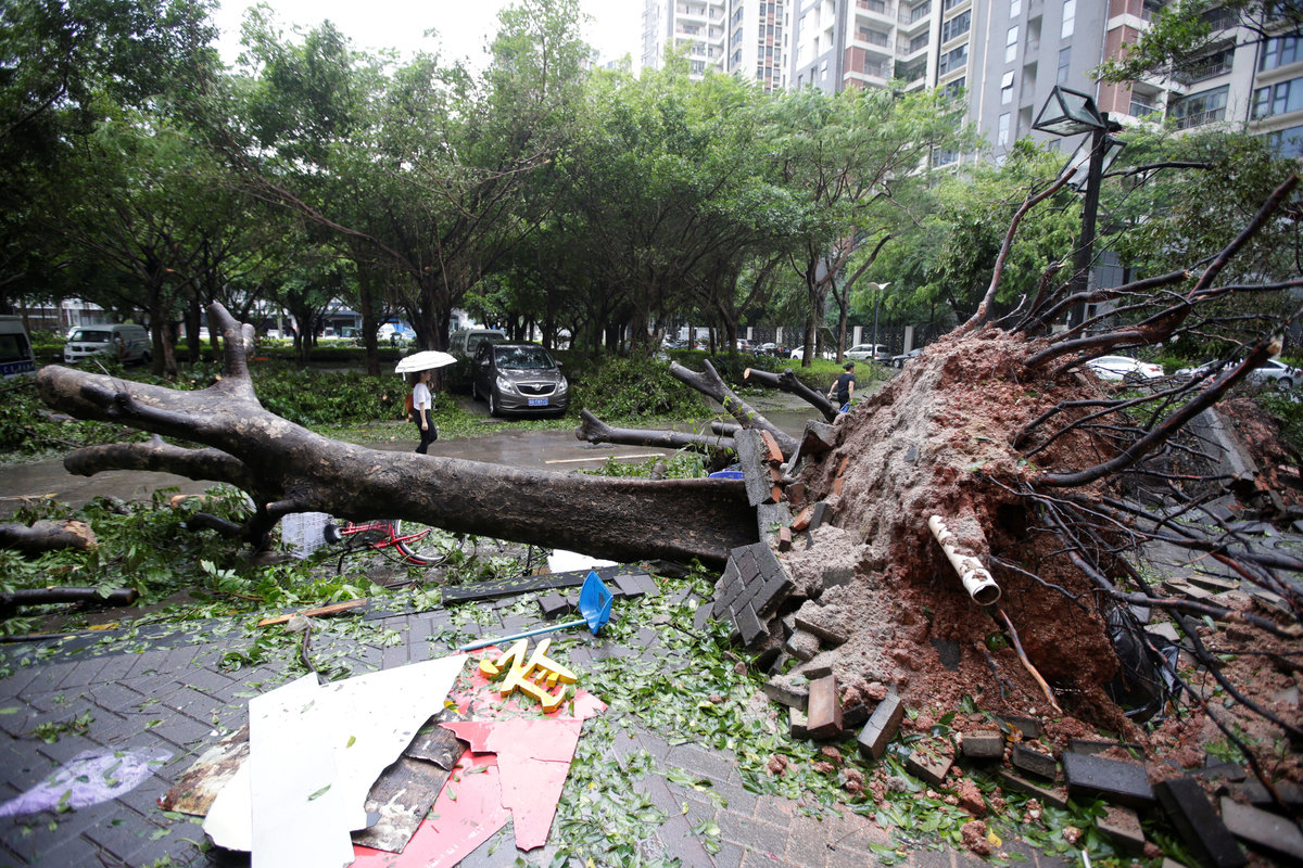 A man walks past uprooted trees on a damaged street after Typhoon Mangkhut hit Shenzhen, Guangdong province, China September 17, 2018. REUTERS/Jason Lee