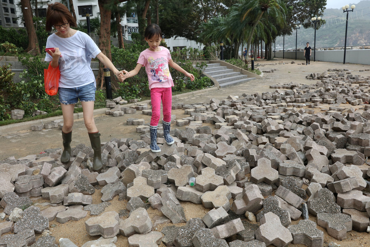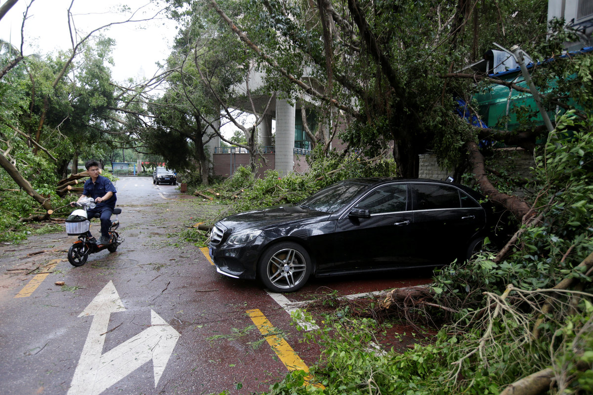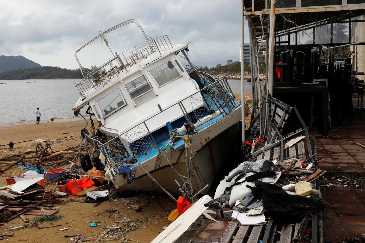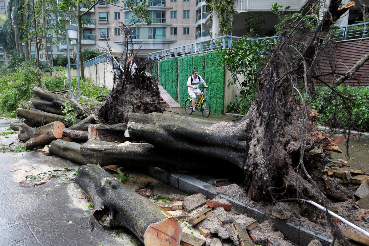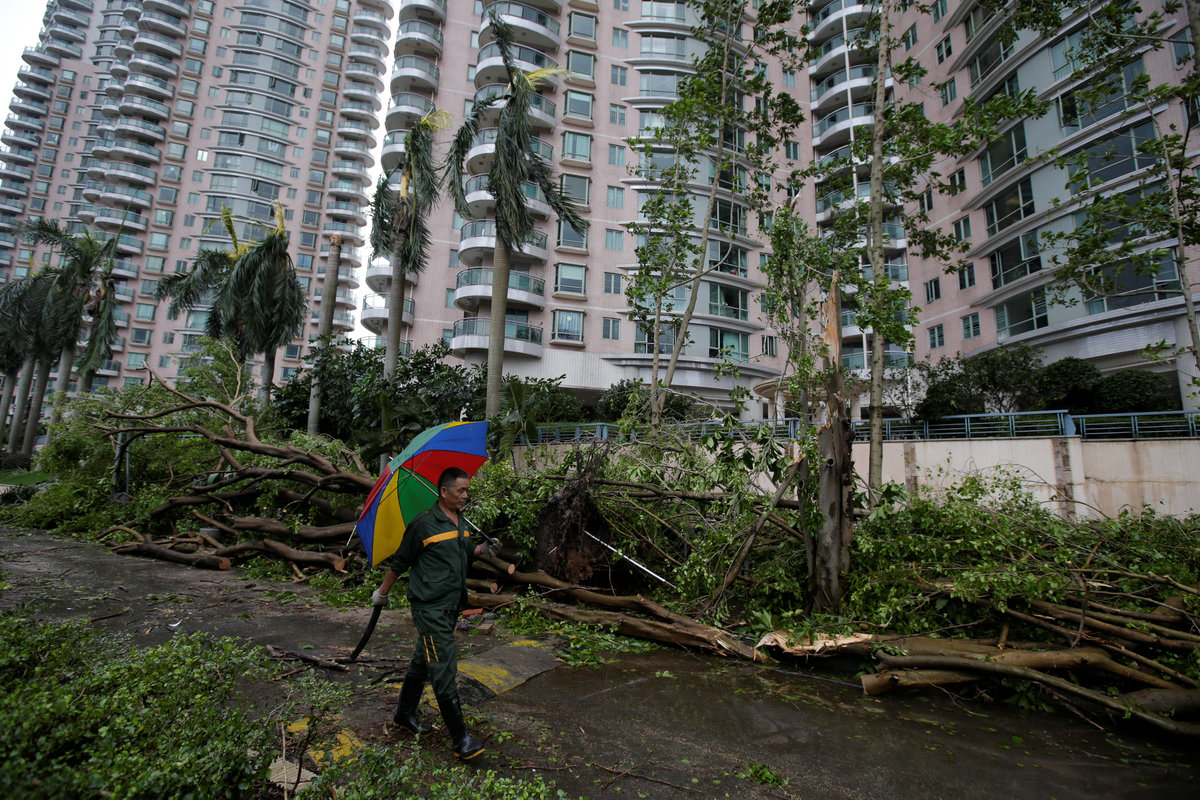 A park is flooded by seawater after Typhoon Mangkhut hit Hong Kong, China September 17, 2018. REUTERS/Ken TungFoam is seen stuck on a car when high waves brought garbage from the sea during the passage of Typhoon Mangkhut, in Hong Kong, China September 17, 2018. REUTERS/Ken TungFoam is washed ashore after Typhoon Mangkhut hit Hong Kong, China September 17, 2018. REUTERS/Ken TungPeople walk on a broken pavement after Typhoon Mangkhut hit Hong Kong, China September 17, 2018. REUTERS/Ken TungA pedestrian wades through waist-high floodwaters on a street amid heavy rainfall as Typhoon Mangkhut hits Zhongshan, Guangdong province, China September 16, 2018. REUTERS/StringerPeople walk on a broken pavement after Typhoon Mangkhut hit Hong Kong, China September 17, 2018. REUTERS/Ken TungAn underground carpark is flooded after Typhoon Mangkhut hit Hong Kong, China September 17, 2018. REUTRERS/Ken TungPeople walk past an uprooted tree after Typhoon Mangkhut hit Shenzhen, Guangdong province, China September 17, 2018. REUTERS/Jason Lee A man walks past fallen trees after Typhoon Mangkhut hit Shenzhen, Guangdong province, China September 17, 2018. REUTERS/Jason LeeA worker talking on her phone as she stands on a street which has been blocked by fallen trees and scattered leaves after Typhoon Mangkhut hit Shenzhen, Guangdong province, China September 17, 2018. REUTERS/Jason LeeDamage is seen at a residential area near the waterfront after Super Typhoon Mangkhut slammed Hong Kong, China September 17, 2018. REUTERS/Ken Tung Damage is seen at a residential area near the waterfront after Super Typhoon Mangkhut slammed Hong Kong, China September 17, 2018. REUTERS/Ken Tung A man rides a bike sharing service bicycle past uprooted trees that have been cut after Typhoon Mangkhut hit Shenzhen, Guangdong province, China September 17, 2018. REUTERS/Jason LeeA man walks past uprooted trees on a damaged street after Typhoon Mangkhut hit Shenzhen, Guangdong province, China September 17, 2018. REUTERS/Jason LeeA man rides a scooter past a vehicle surrounded by fallen trees after Typhoon Mangkhut hit Shenzhen, Guangdong province, China September 17, 2018. REUTERS/Jason LeeDamage is seen at a residential area near the waterfront after Super Typhoon Mangkhut slammed Hong Kong, China September 17, 2018. REUTERS/Ken Tung People walk past an uprooted tree after Typhoon Mangkhut hit Shenzhen, Guangdong province, China September 17, 2018. REUTERS/Jason LeeA woman runs in the rainstorm as Typhoon Mangkhut approaches, in Shenzhen, China September 16, 2018. REUTERS/Jason Lee A driver removes a fallen tree during Typhoon Mangkhut in Hong Kong, China September 16, 2018 in this still image obtained from a social media video. INSTAGRAM/ @pcmarriott / YOUTUBE/pcmarriotthk/via REUTERS A man trapped in raging flood waters caused by Typhoon Mangkhut is pictured before his rescue in Tarlac, Philippines, in this still image from a September 15, 2018 video from social media. Aquino Lord/Social Media/via REUTERSPeople prepare to rescue a man (not pictured) trapped in raging flood waters caused by Typhoon Mangkhut in Tarlac, Philippines, in this still image from a September 15, 2018 video from social media. Aquino Lord/Social Media/via REUTERS