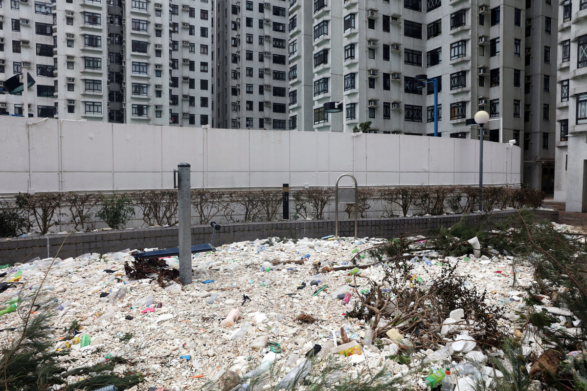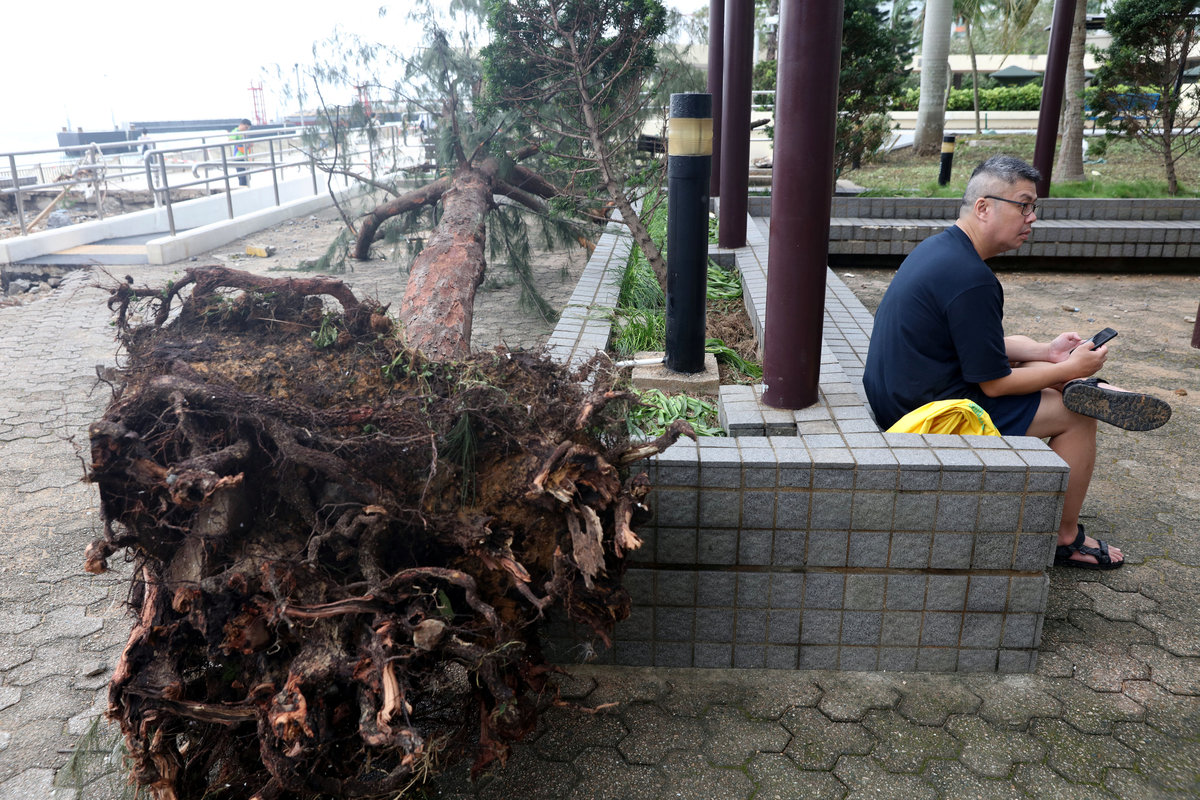 Foam is washed ashore after Typhoon Mangkhut hit Hong Kong, China September 17, 2018. REUTERS/Ken TungA man rests beside a fallen tree after Typhoon Mangkhut hit Hong Kong, China September 17, 2018. REUTERS/Ken Tung