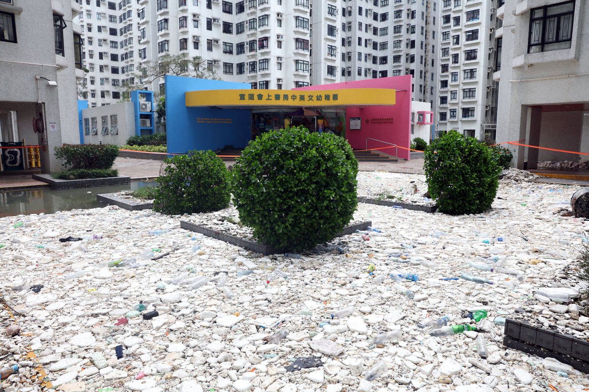Across Hong Kong, authorities strived to clear roads of debris, including toppled trees and bamboo scaffolding. Some buildings, including the One Harbourfront office tower, had many windows smashed after a day in which some of the city's skyscrapers had swayed with the ferocious gusts.