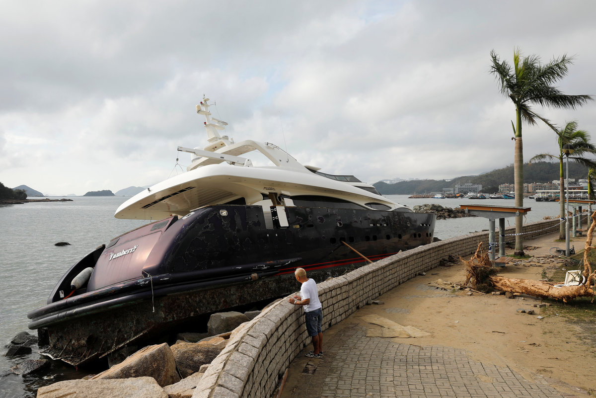 A yacht is seen being moved onto the seawall after Super Typhoon Mangkhut hit Hong Kong, China September 18, 2018. REUTERS/Tyrone Siu