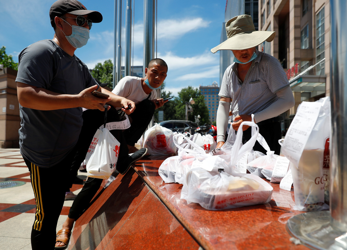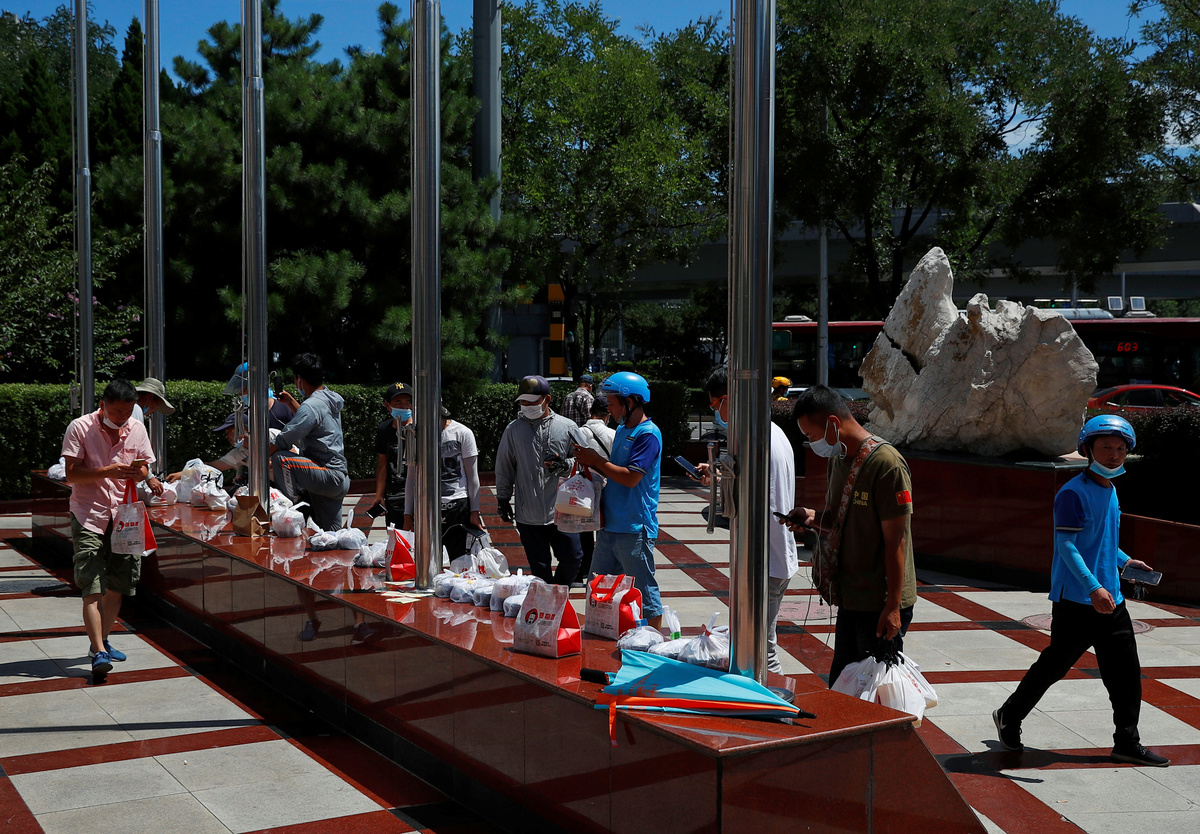 Food delivery drivers pick up their parcels at a makeshift lunch hour distribution spot outside an office building following an outbreak of the coronavirus disease (COVID-19) in Beijing, China, August 4, 2020. REUTERS/Thomas Peter