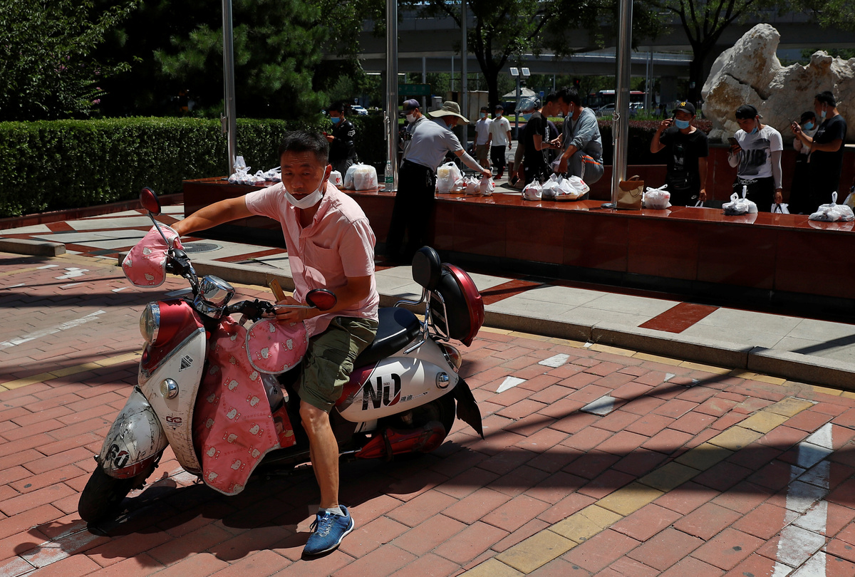 A food delivery rider leaves after picking up parcels at a makeshift lunch hour distribution spot outside an office building following an outbreak of the coronavirus disease (COVID-19) in Beijing, China, August 4, 2020. REUTERS/Thomas Peter